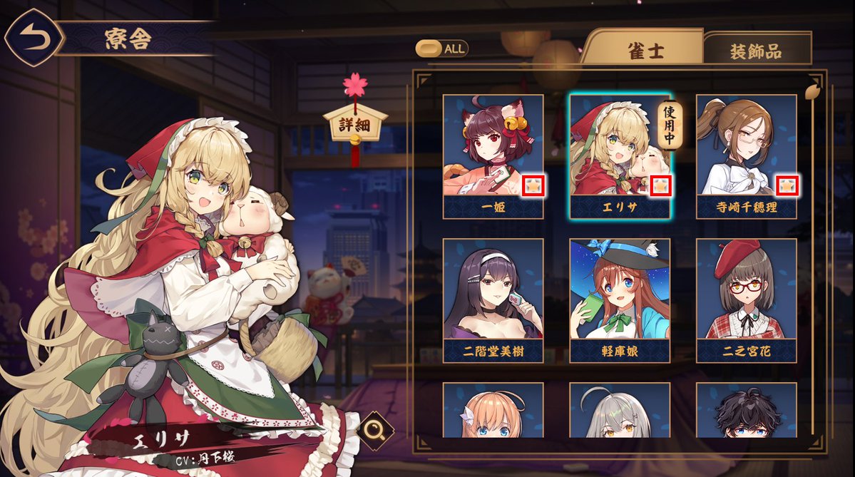 また、寮舎中央上部にある「ALL」を「☆」に切り替える事で、お気に入り雀士のみを表示させることができます!