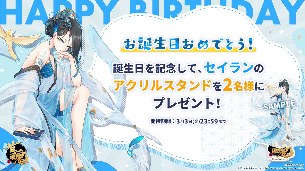 誕生日を記念して、抽選で2名様に「セイラン」のアクリルスタンドをプレゼント!