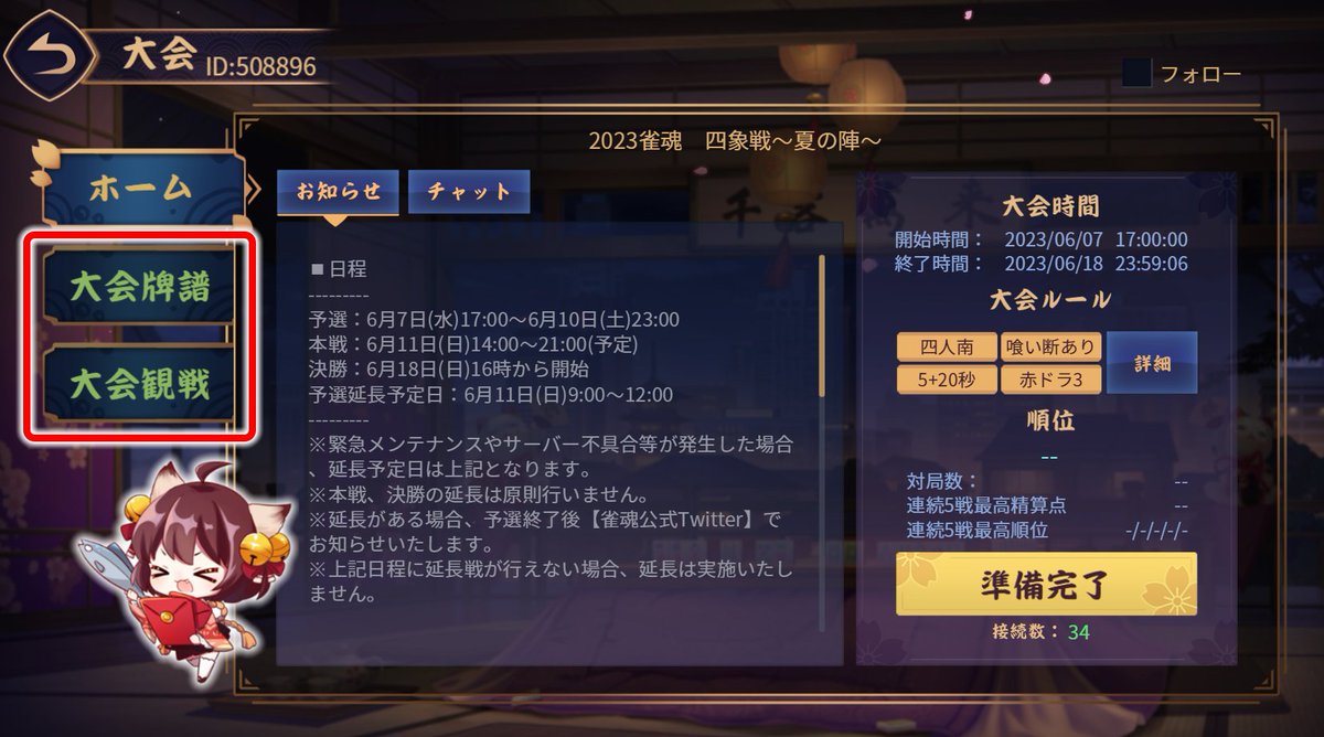 大会ロビー画面内左の「大会観戦」「大会牌譜」より、大会参加者以外でも対局の観戦や、過去の対局の牌譜を確認することができますのでご活用ください!
