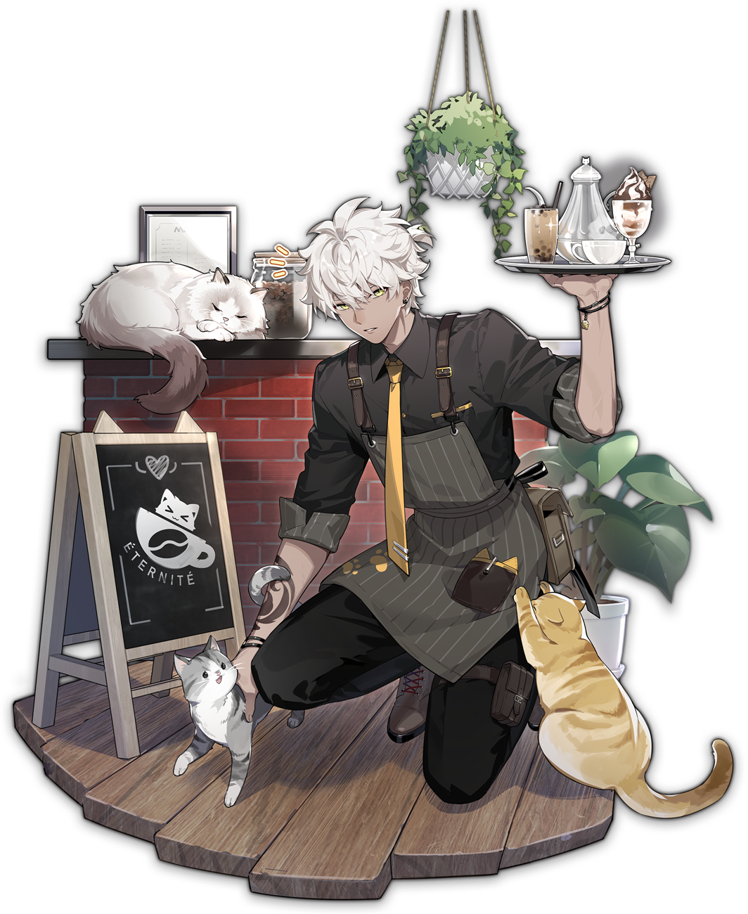 "Instead of visiting me, you are actually here to pet the cats, right? Don't worry, being enamored by fluffy animals is not a sin... Don't look at me like I'm a cat, face the reality, I'm not a cat and bribing me with cat food is futile... Coffee won't work either."