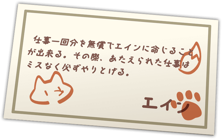 건네받은 것은 '무료 고용권'이었다. 그 위에는 이렇게 쓰여 있었다: 고용주 PLAYER, 본 고용권을 사용하여 에인에게 한 가지 일을 무료로 맡길 수 있음. 실력 보장, 임무 완수. 에인