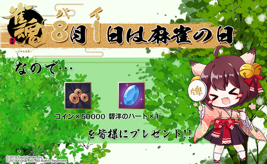 1132952998290706432 1158663855062470656 【お知らせ】 明日8月1日は麻雀"牌(81)"の日! こちらを記念し、明日00:00~23:59にログインしていただいた雀士の皆さまに、下記アイテムを配布いたします! ・コイン × 50000 ・碧洋のハート × 1 明日も雀魂で麻雀をしよう♪ #雀魂 #じゃんたま #麻雀の日 keyword_er: コイン, 碧洋のハートTags: ログインボーナス麻雀の日categoryTweets: アイテム配布 259 reads