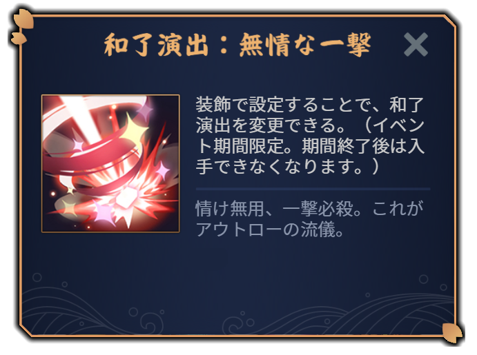1780797147530907999 1780789597720441168 2024-04-18 12:00【装飾品紹介】 和了演出:無情な一撃 情け無用、一撃必殺。これがアウトローの流儀。 #雀魂 #じゃんたま #雀魂ブルアカコラボ https://t.co/iGlJp9uKW4 228 reads 日本語