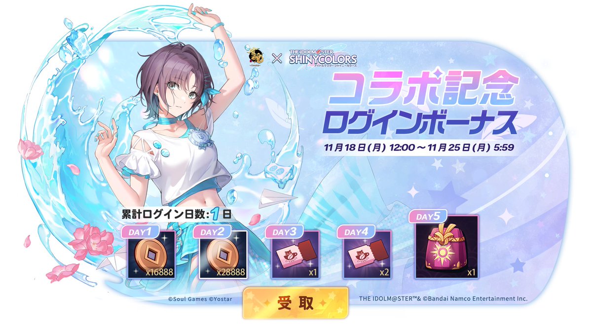 1857242120844915029 1859778834444452106 【アイドルマスター シャイニーカラーズ × 雀魂 コラボ決定記念ログインボーナス】 11月18日(月)12:00~11月25日(月)5:59の期間中ログインすることで、 累計日数により特別な報酬を獲得できます! #雀魂 #じゃんたま #雀魂シャニマスコラボ keyword_er: ハッピークーポン, 日光の福袋, コインTags: ログインボーナスコラボcategoryTweets: アイテム配布 192 reads